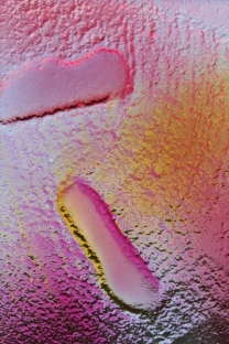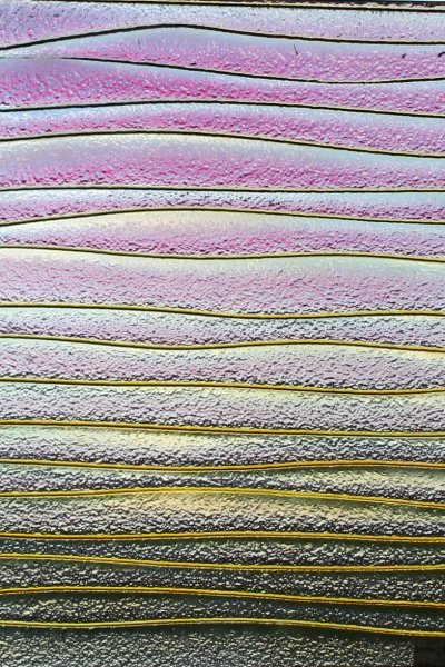 Prachtige structuren in combinatie met transparante kleuren laten het glas sprankelen. Deze glastechniek kan bijvoorbeeld gebruikt worden voor een keuken achterwand van glas.